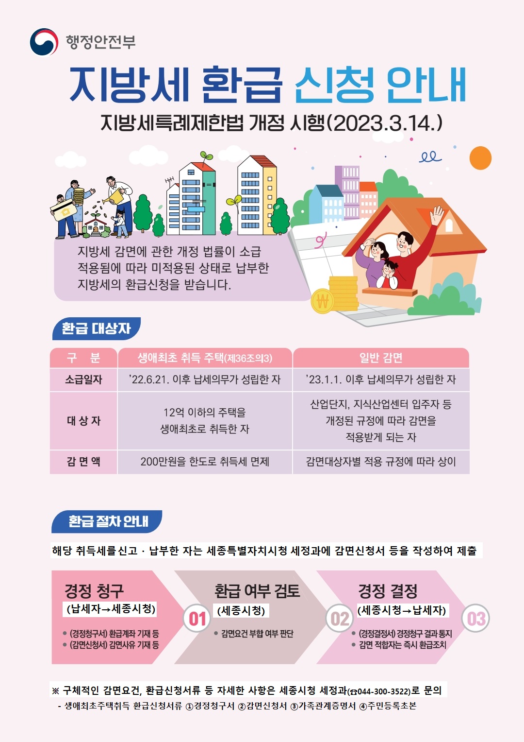 세종시에서는 지방세 감면에 관한 개정 법률이 소급 적용 됨에 따라 미적용된 상태로 납부한 지방세의 환급 신청을 받습니다. 지방세특례제한법 개정 시행(2023.3.14.)에 따라 생애최초 주택 구입자에 대한 취득세 감면이 확대되었습니다. 당초 취득가액 3억 원 이하 및 소득기준 규정이 있었으나, 개정되어 취득가액이 12억 원 이하 및 소득기준이 없어지는 등 대상자가 확대되었습니다. 아래 내용을 확인 후 대상에 해당되시면 환급청구하여 주시기 바랍니다.