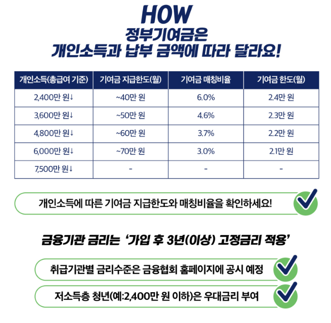 - 개인소득 6,000만 원~7,500만 원, 기준 중위소득 180% 이하 청년도 가입은 가능하나, 정부기여금 지급 없이 이자소득 비과세 혜택만 부여