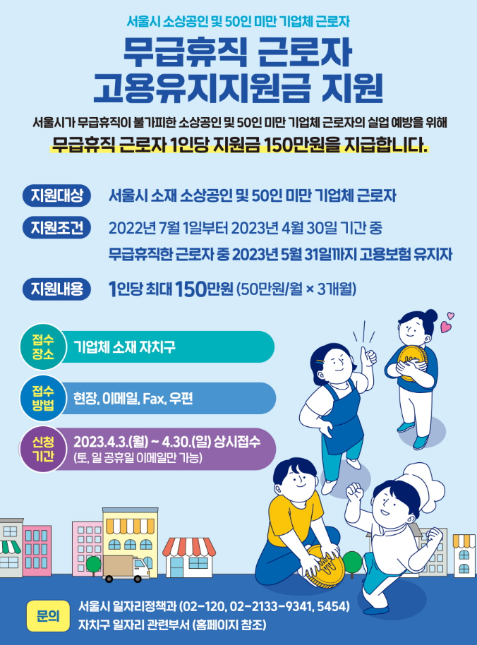 서울시에서는 불가피한 상황으로 무급휴직을 하게 된 소상공인 및 50인 미만 기업체 근로자의 실업 예방을 위해 지원급을 지급한다고 합니다. 해당이 되시는 분들의 적극적인 참여 바랍니다.