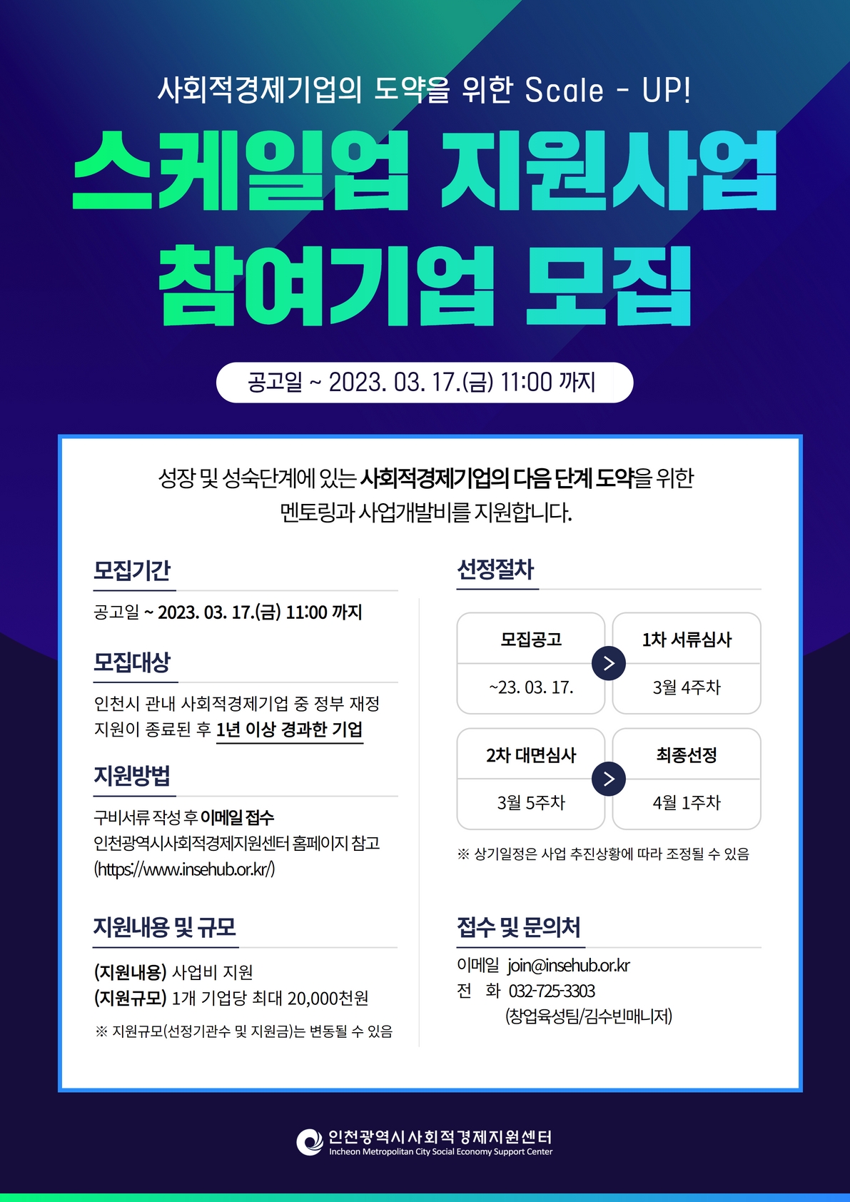 대면 심사 : 심사일시 - 2023년 4월 중 (홈페이지 및 개별 연락 예정) 심사장소 : 인천광역시 사회적 경제지원센터(JST 13층. 회의실) 심사방법 : 심사위원회 구성을 통한 대면 심사 - 심사기준 : 사업계획서 상 사업목표가 명확한 기업의 경우 선정에 유리함