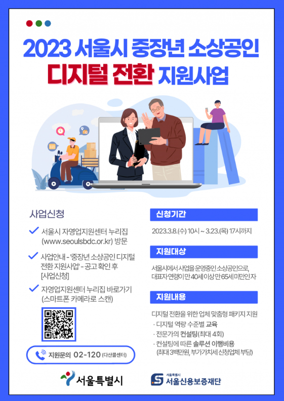 디지털 취약업종 (숙박. 음식점업. 제조업. 수리. 기타 서비스업), 디지털 취약연령(만 50세 이상)[근거, 21 소상공인 디지털 전환 현황 및 단계별 추진전략, 중소벤처연구원] 디지털 전환을 통한 소상공인의 지속가능한 성장을 도모하기 위하여 중장년 소상공인 디지털 전환 지원사업의 상반기 참여 소상공인을 모집하오니 많은 참여 바랍니다
